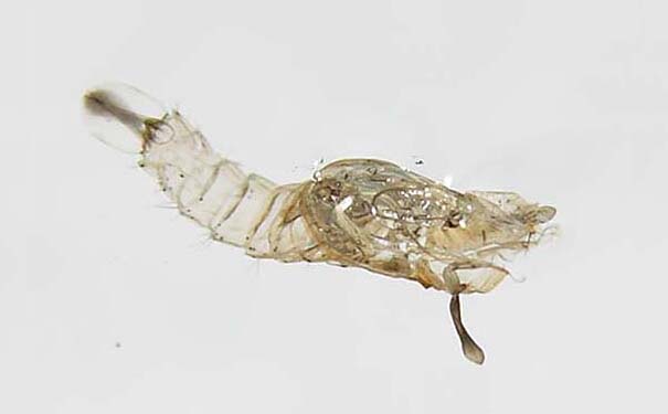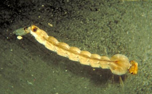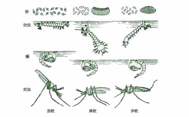 庫蚊(家蚊)的(de)孑孓(jué)尾(wěi)端具有1條長呼吸管,管端為呼吸器的開口。呼吸時(shí),身體與水麵成一角度,使呼吸管垂直於水麵;按蚊(瘧蚊)無呼(hū)吸管;孑孓尾端(duān)的呼吸器開口於身體表麵,呼吸時,身體與水麵平行。孑孓經4次蛻皮後發育成蛹,由蛹再羽化為成蚊。